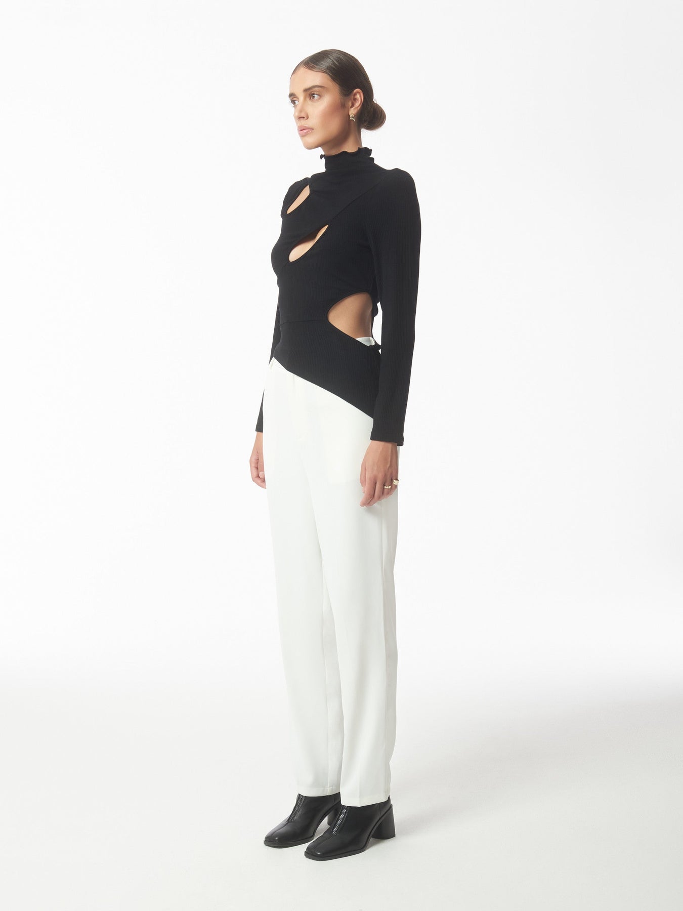 This cutout knit top is part of SOUR FIGS Pre Spring/Summer collection, setting the tone for the striking, skin-baring outfits throughout this new drop. Featuring daring cutout details, an asymmetric silhouette, and a scalloped turtleneck, this black sweater top is made from stretch-jersey that closely hugs your body. Wear yours with statement jewelry pieces to match a runway style.
