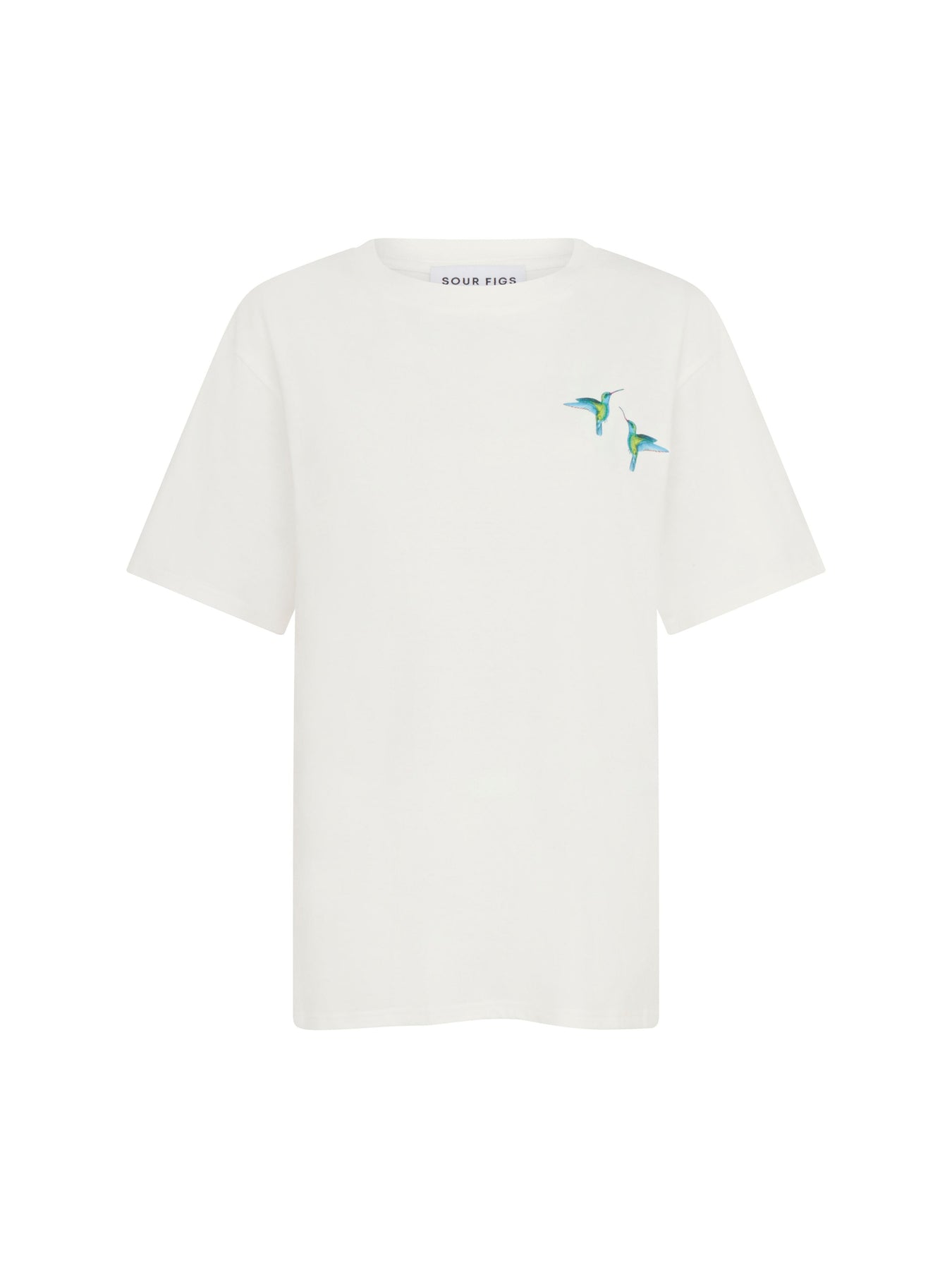 SOUR FIGS white t-shirt is crafted from premium cotton, detailed with hummingbird duo print. Cut to a relaxed unisex fit with a ribbed crew neck.