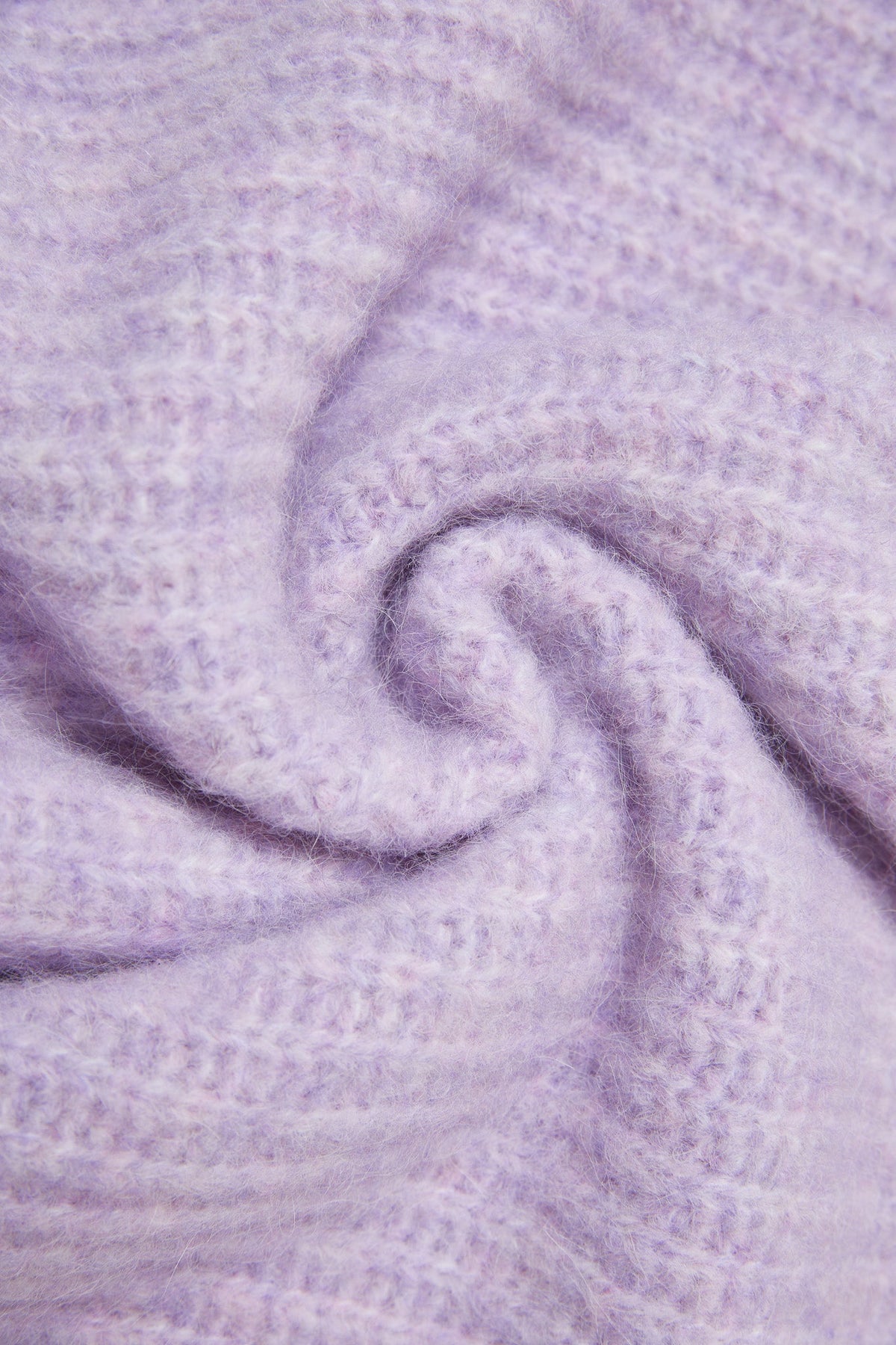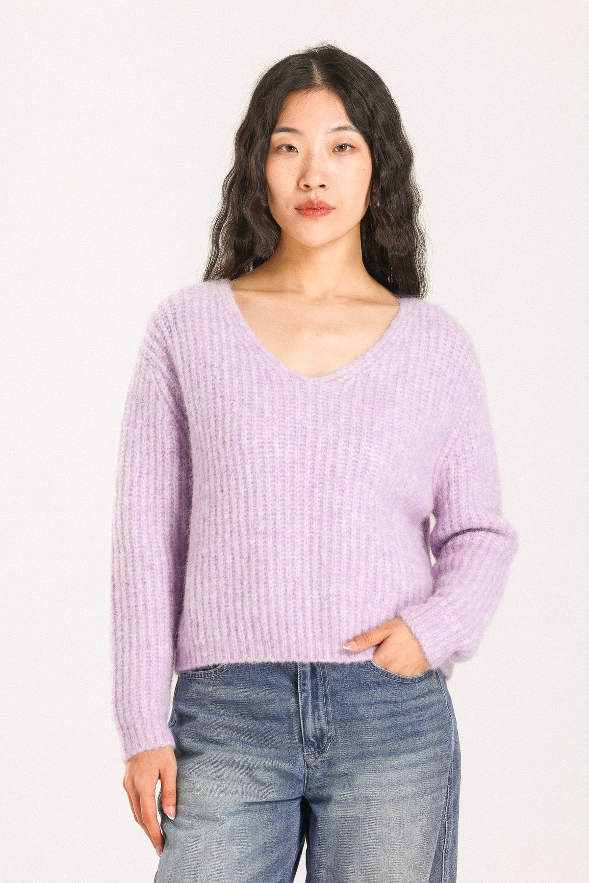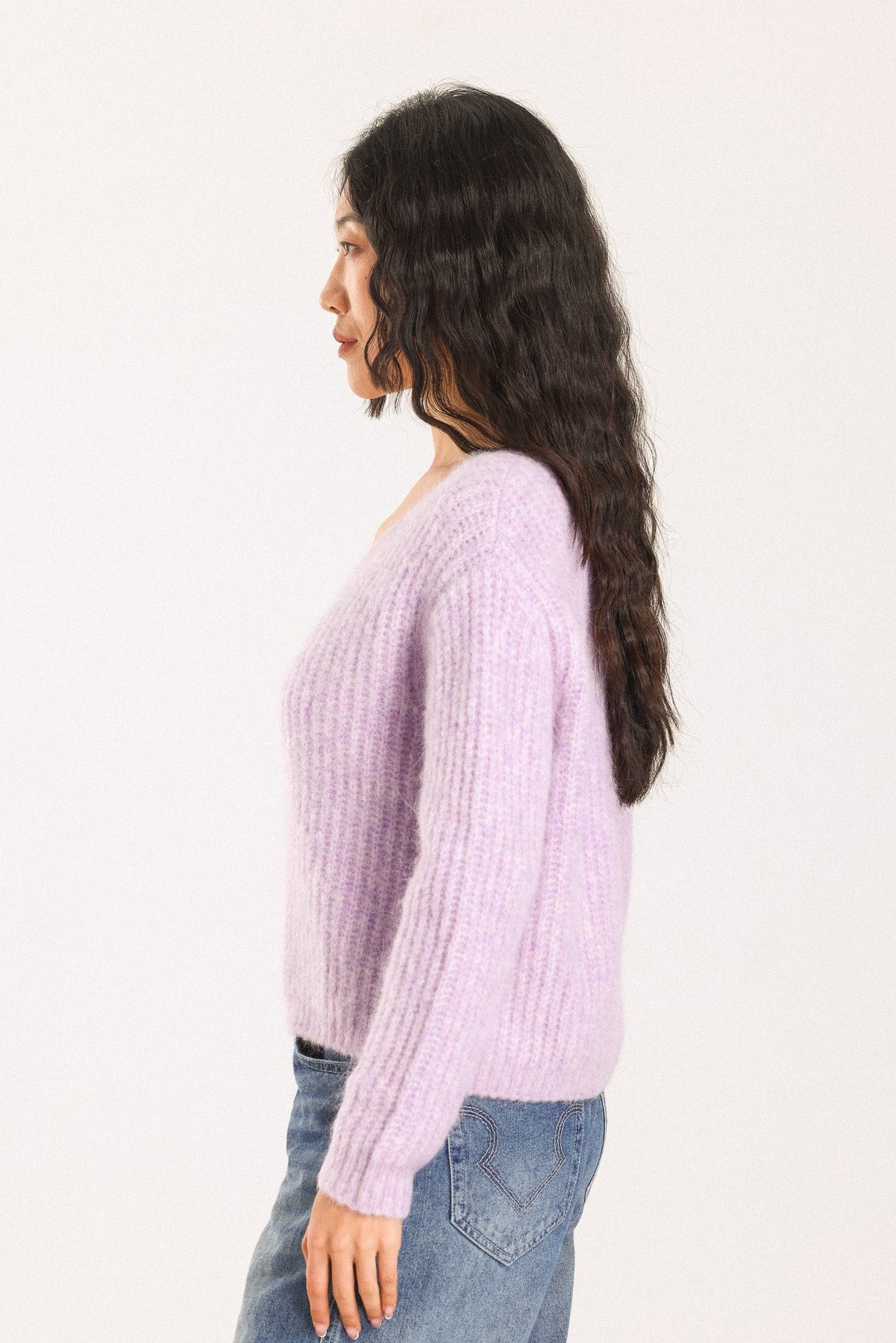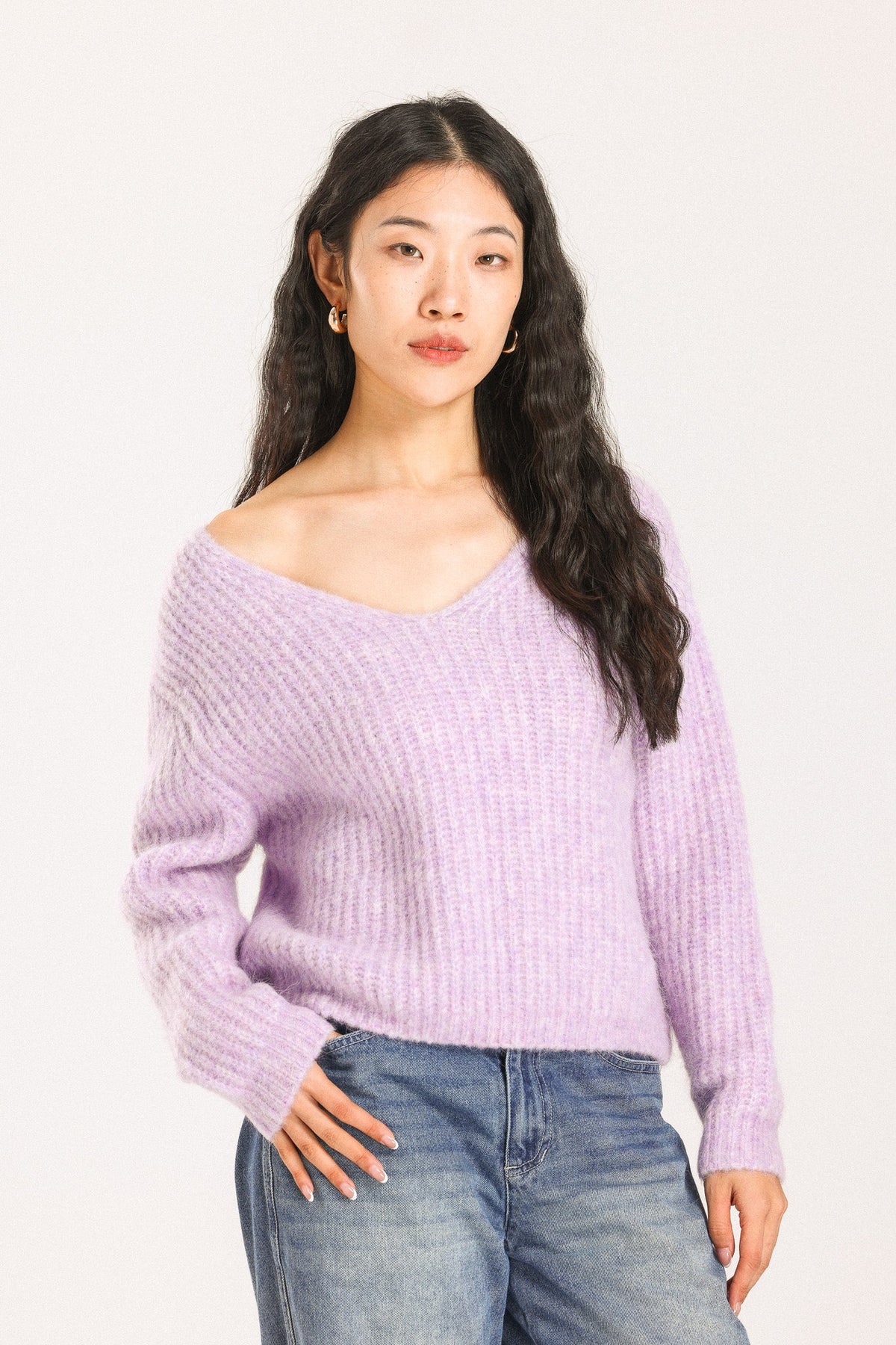 This charming lavender sweater features a relaxed fit with a V-neckline, adding a soft, pastel touch to your wardrobe.