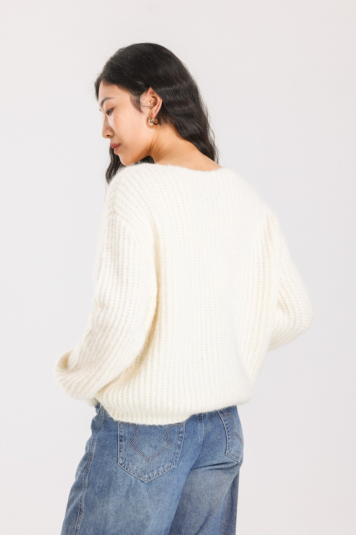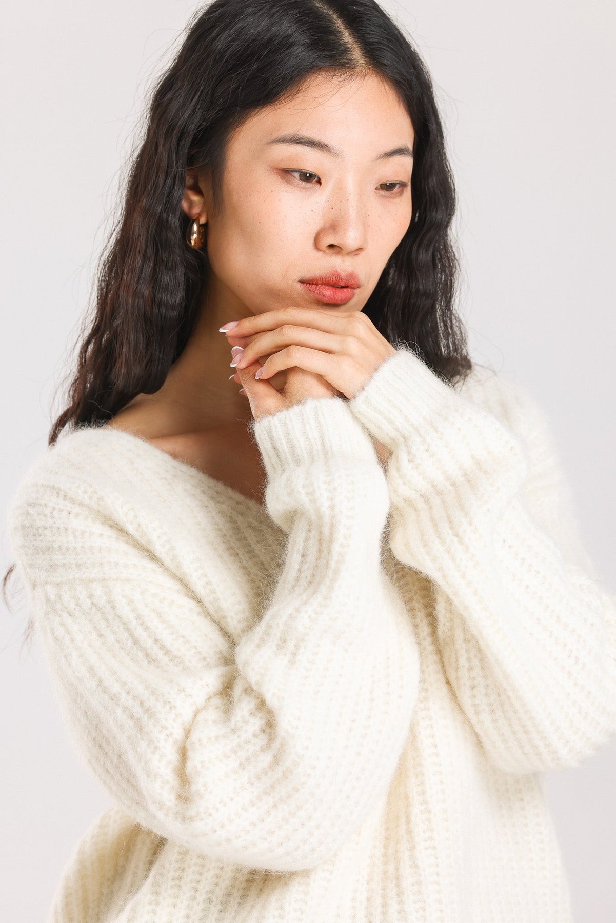 This cream jumper features a relaxed fit with a V-neckline, bringing a timeless elegance to your wardrobe.