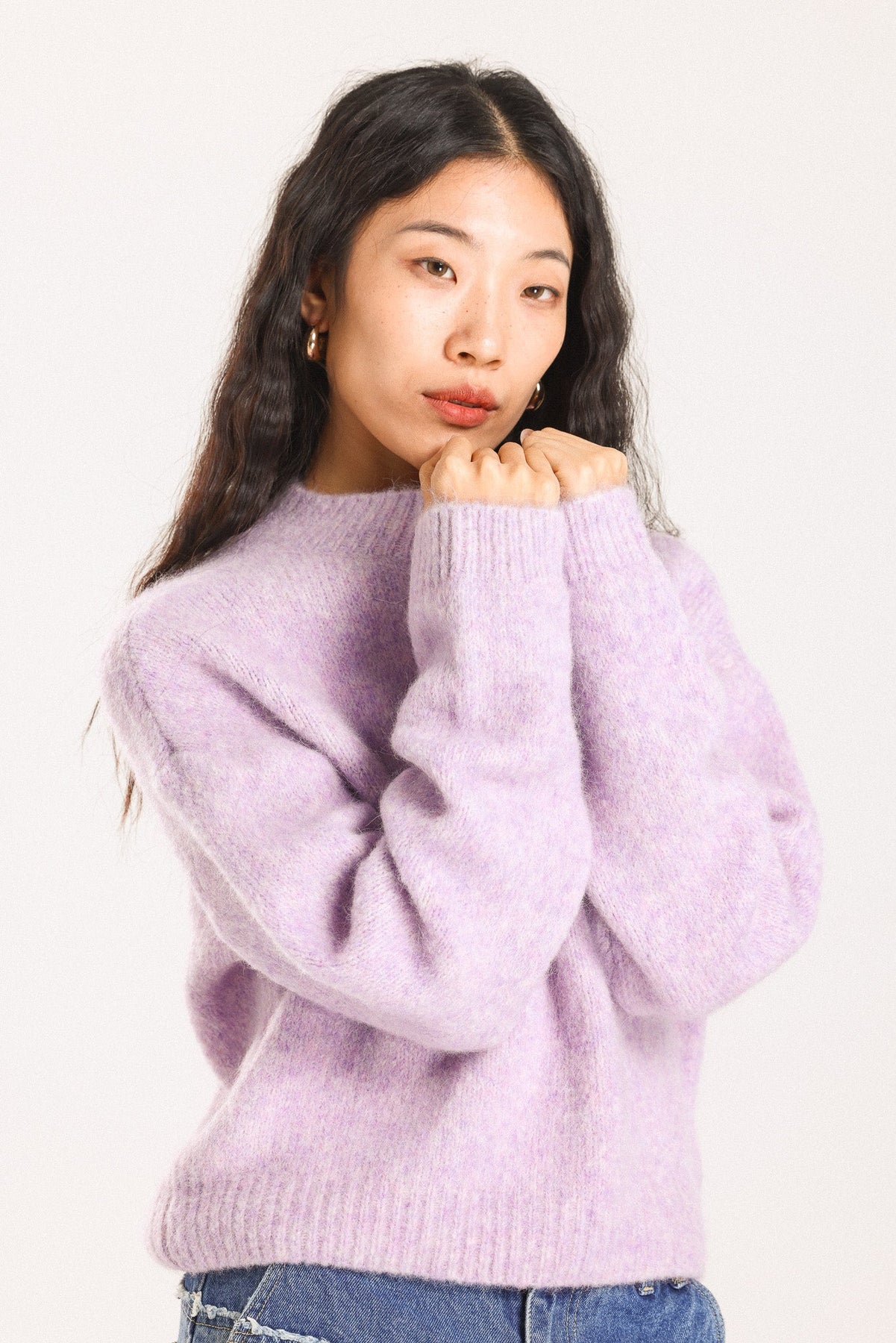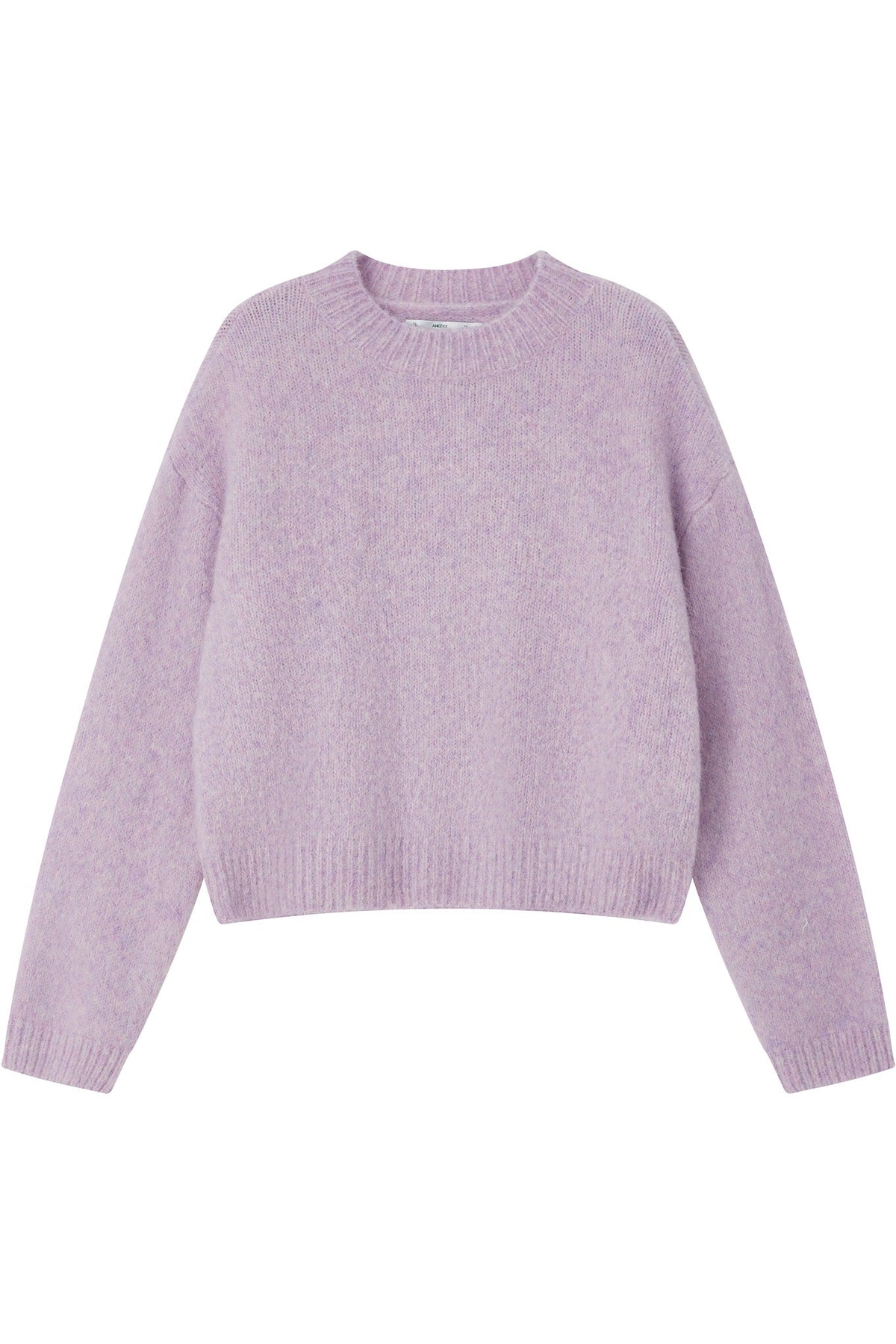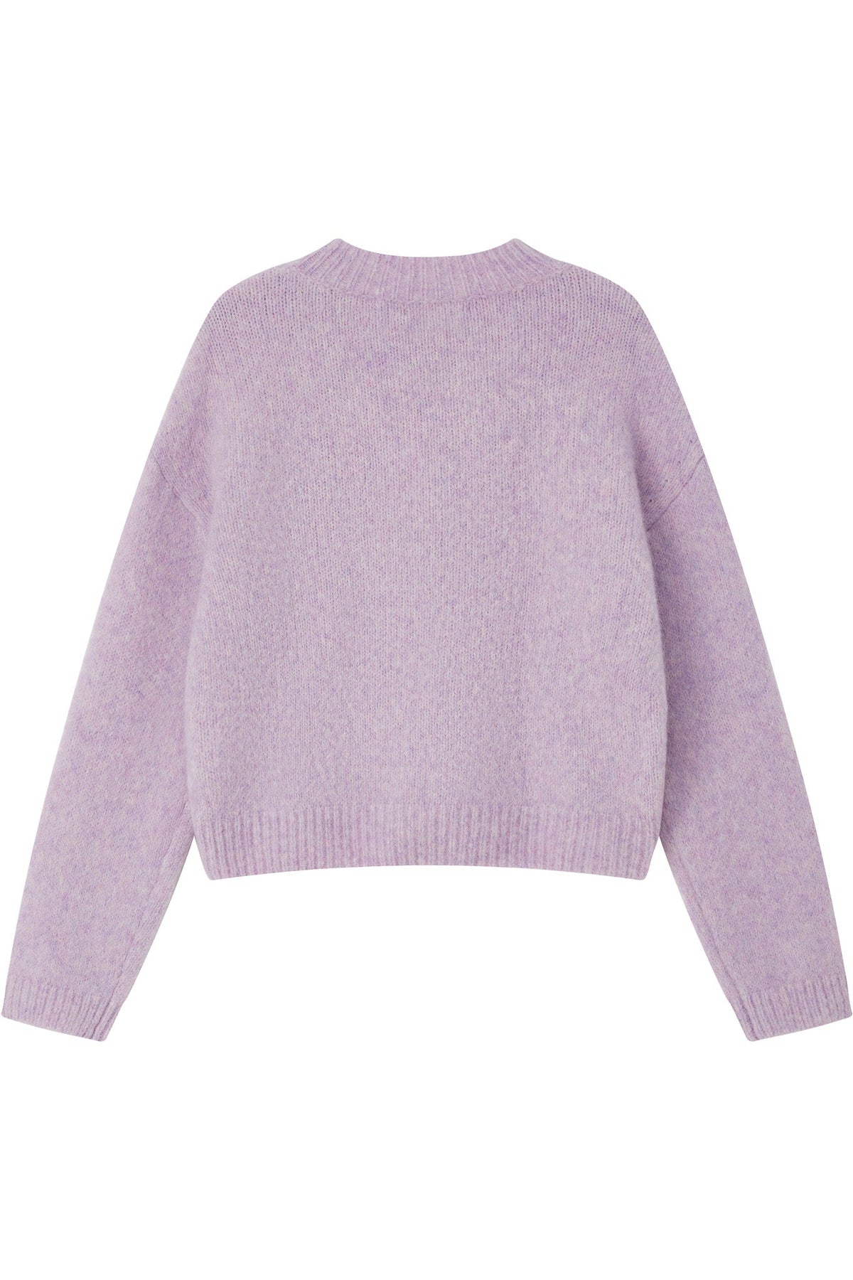 This delicate light purple sweater features a relaxed silhouette with a classic crew neckline, offering a soft and elegant pastel touch to your wardrobe.