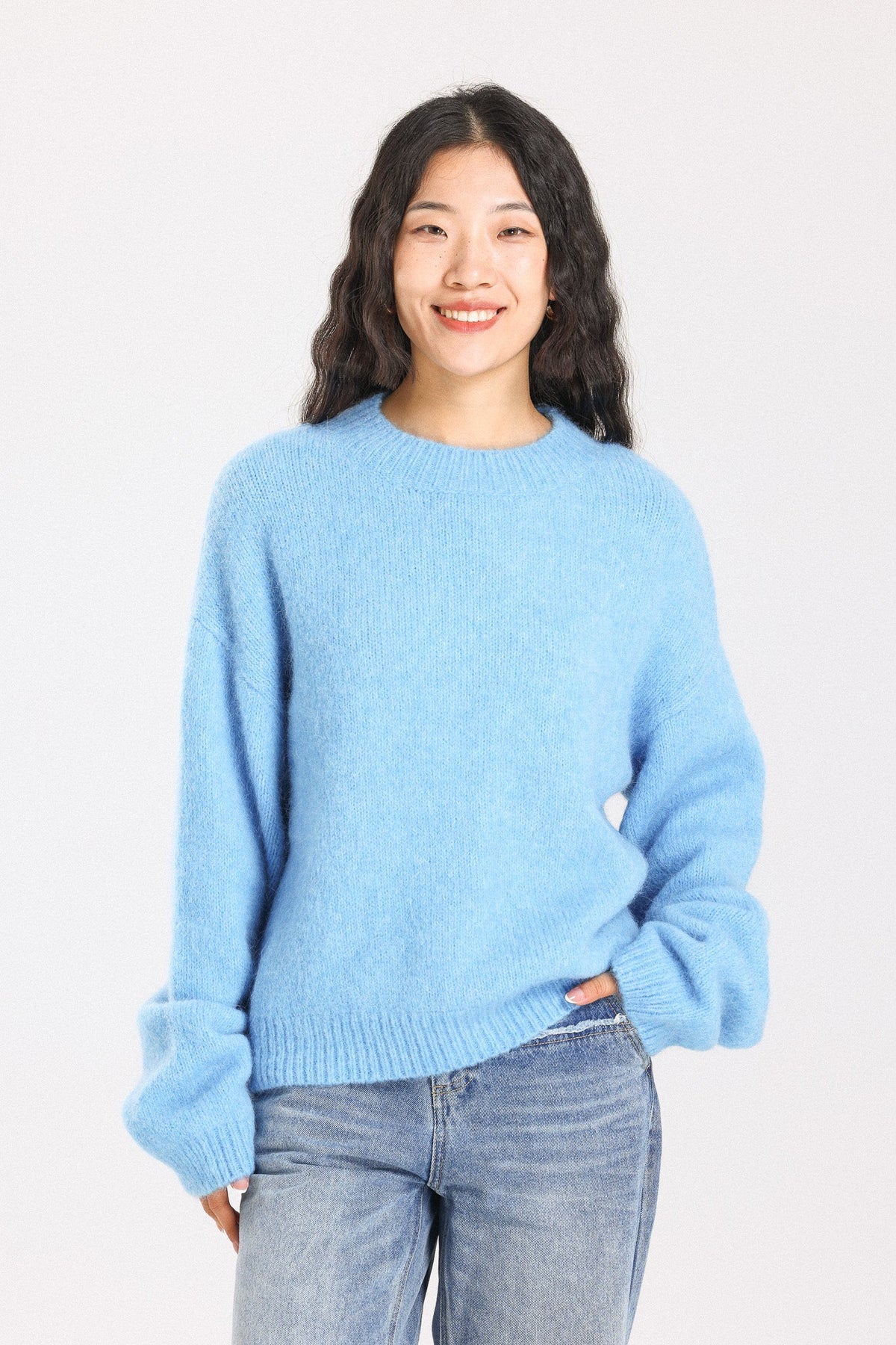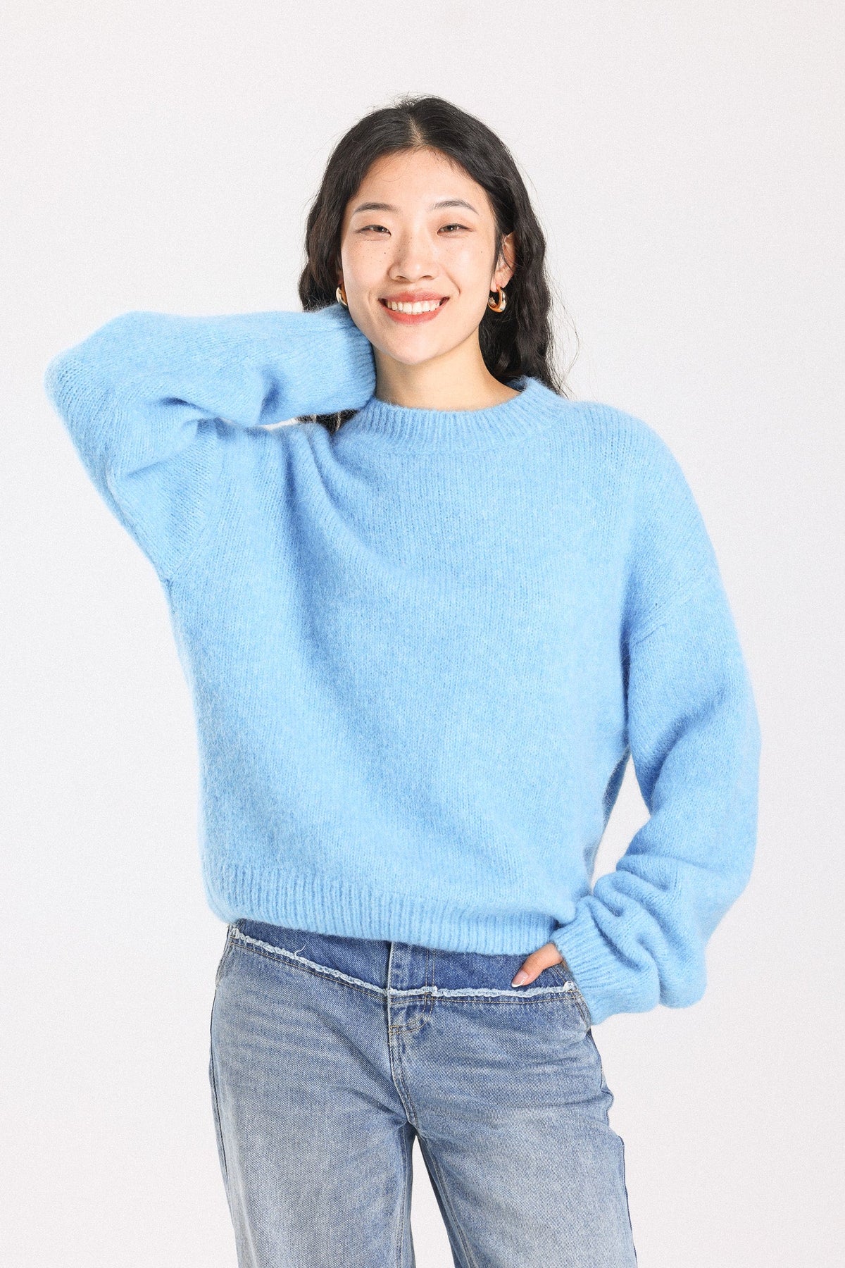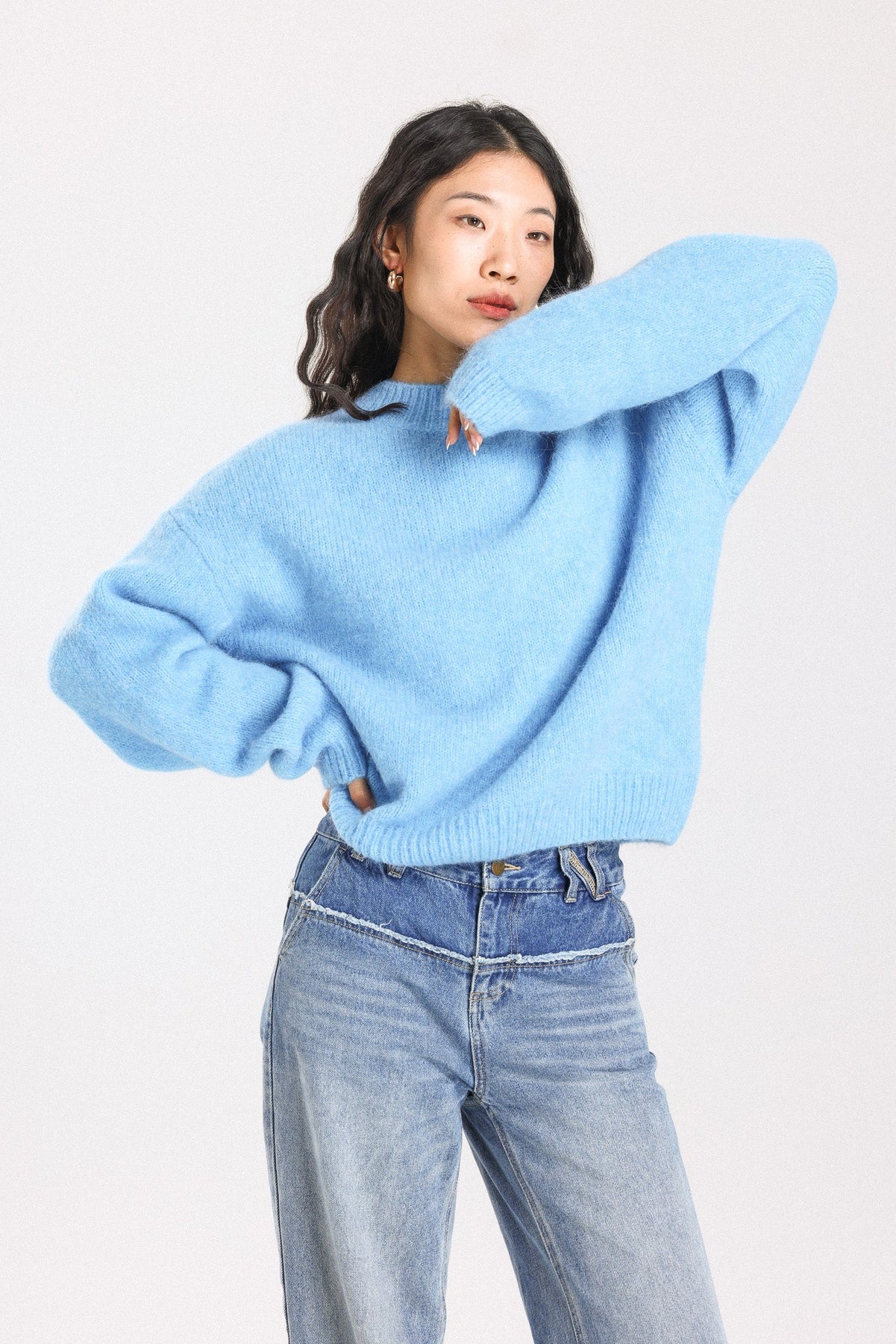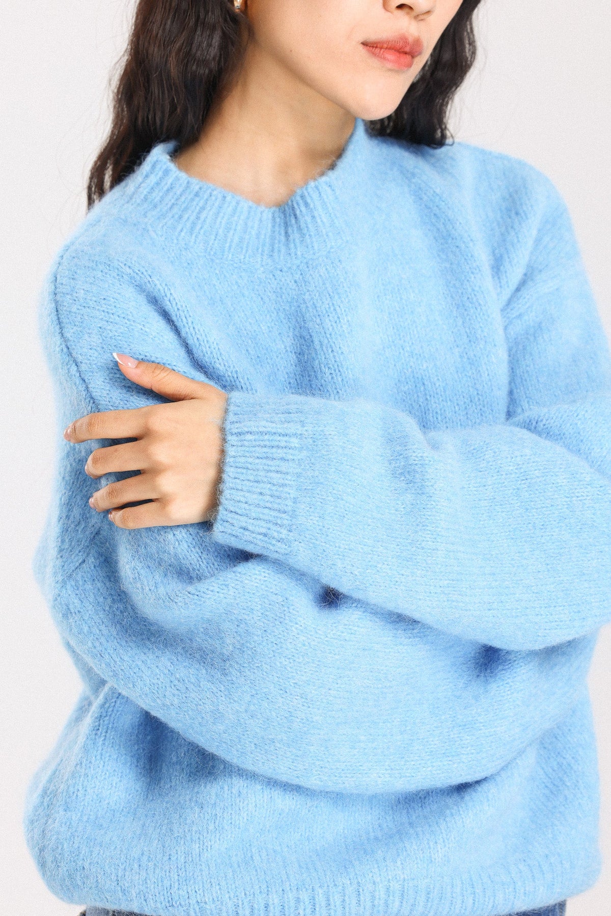 This stylish sky blue sweater offers a relaxed silhouette with a classic crew neckline, bringing a pop of color and warmth to your outfit.