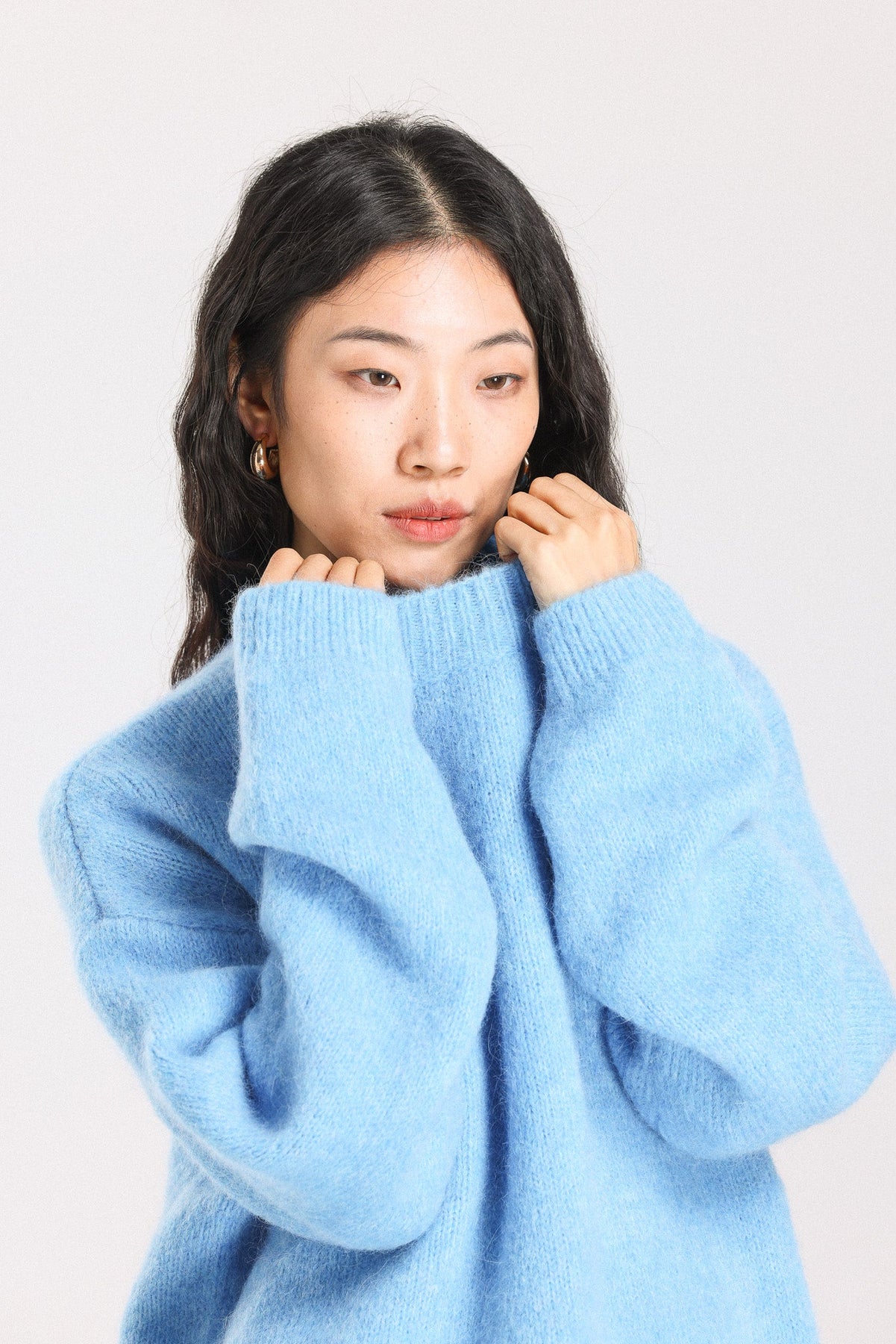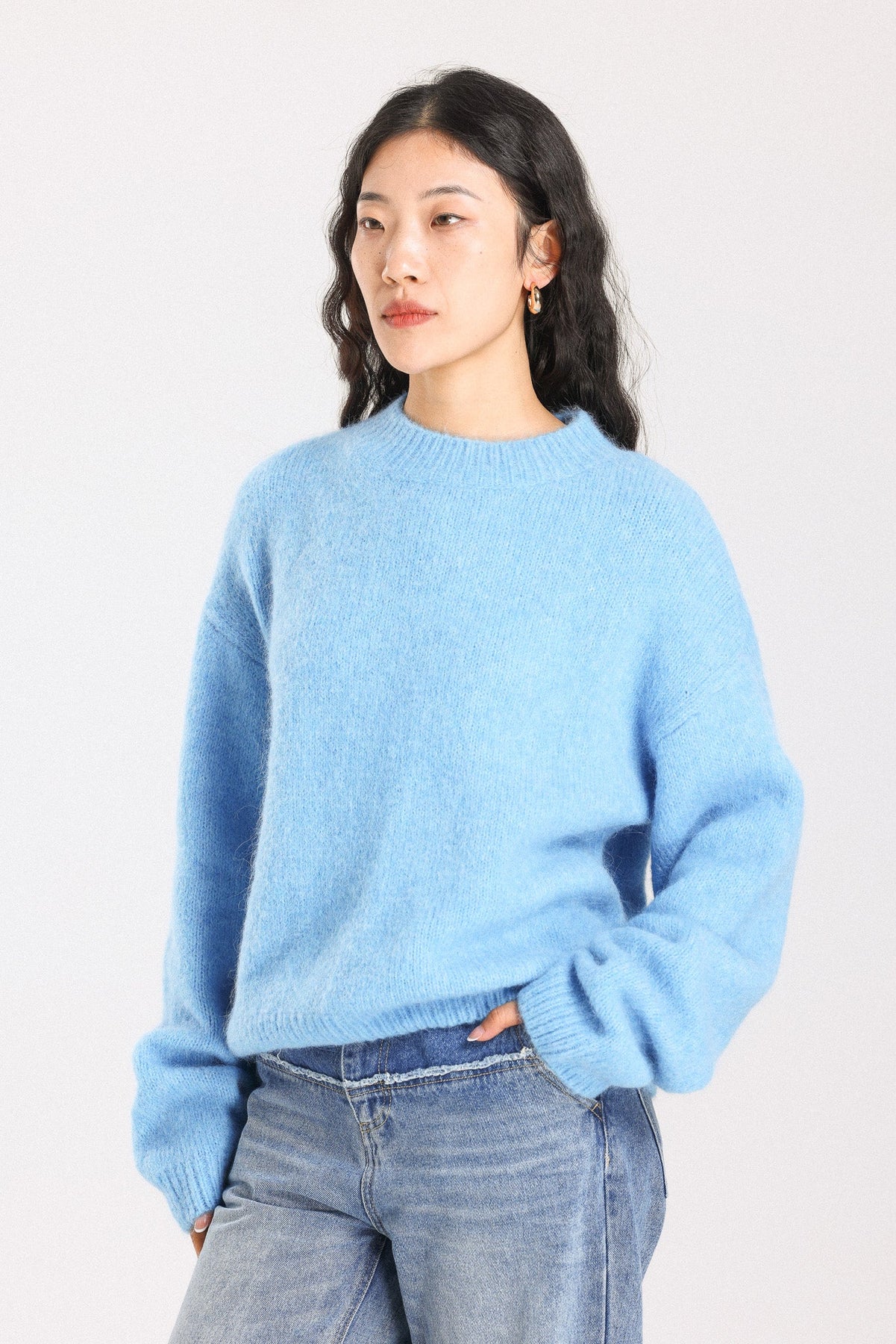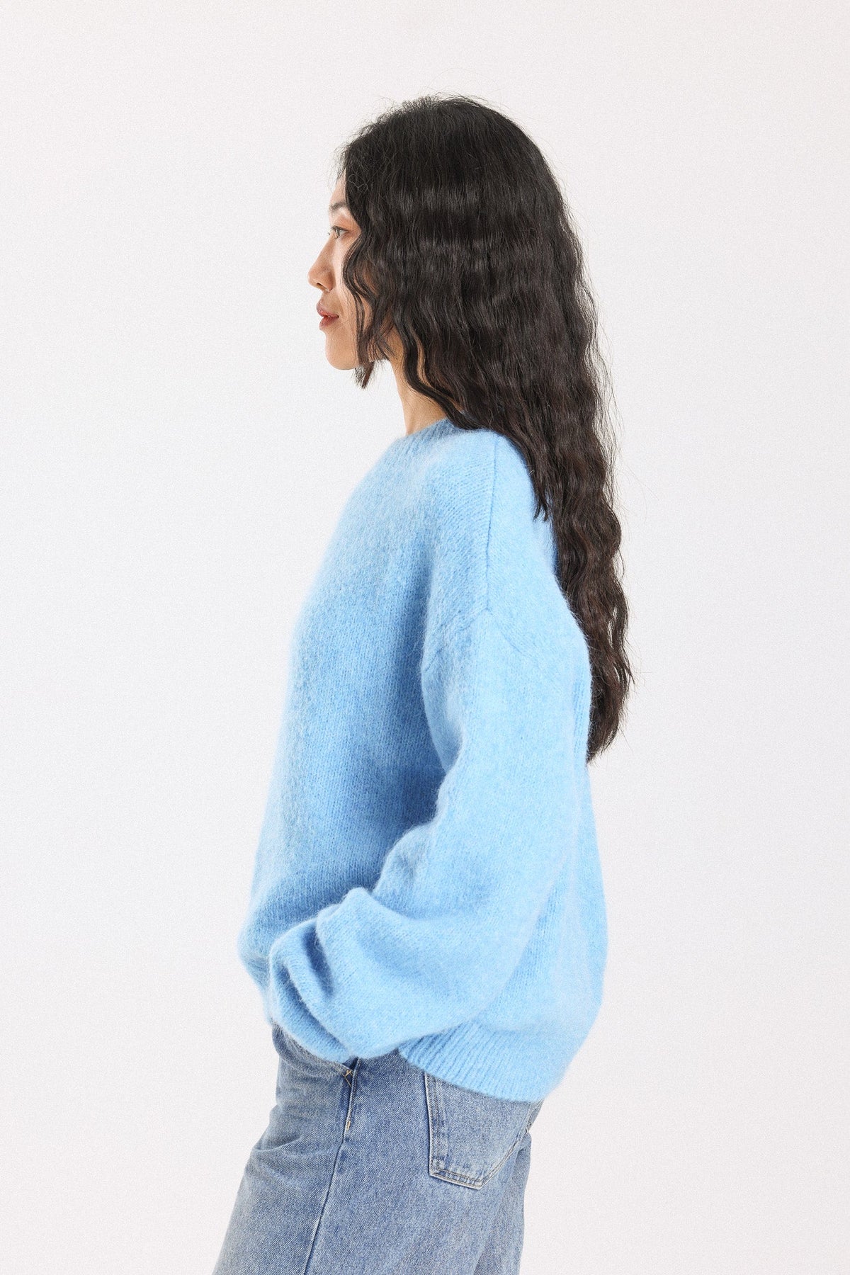 This stylish sky blue sweater offers a relaxed silhouette with a classic crew neckline, bringing a pop of color and warmth to your outfit.