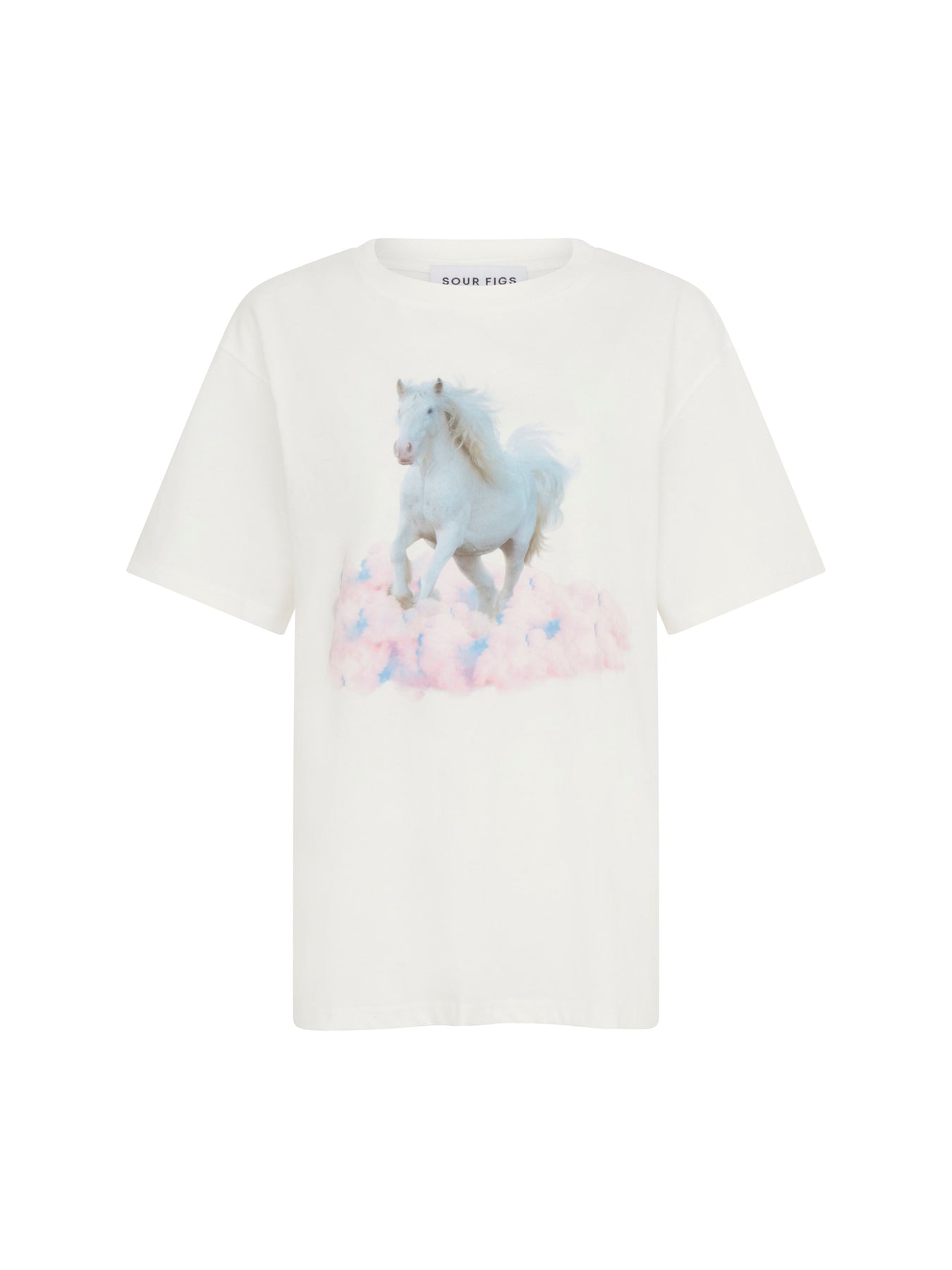 SOUR FIGS white t-shirt is crafted from premium cotton, detailed with a white horse print. Cut to a relaxed unisex fit with a ribbed crew neck.