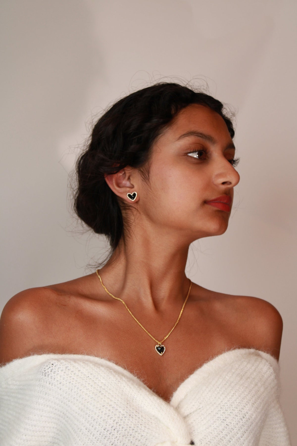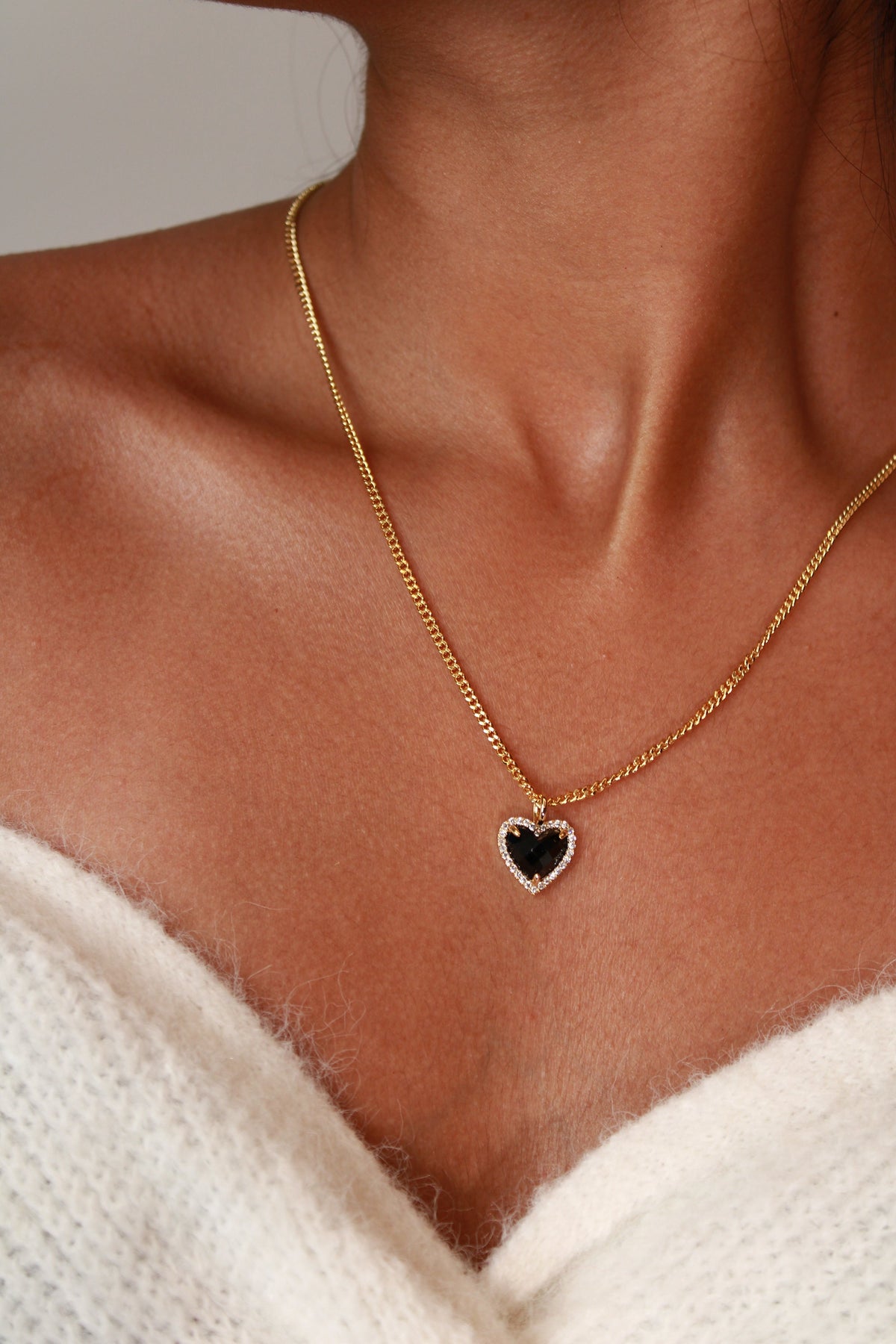 this elegant heart-shaped pendant necklace features a stunning black stone at the centre, surrounded by a delicate border of crystals. Set on an 18K gold-plated recycled brass chain, this necklace offers timeless sophistication with a modern edge. The adjustable length ensures a perfect fit, while the waterproof design guarantees long-lasting durability.