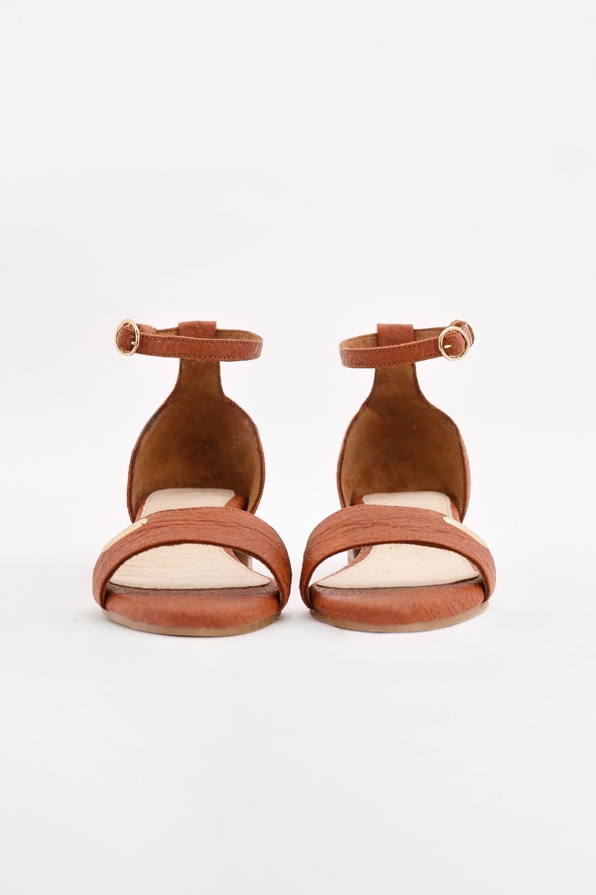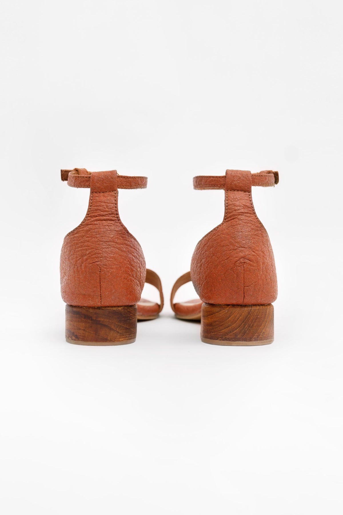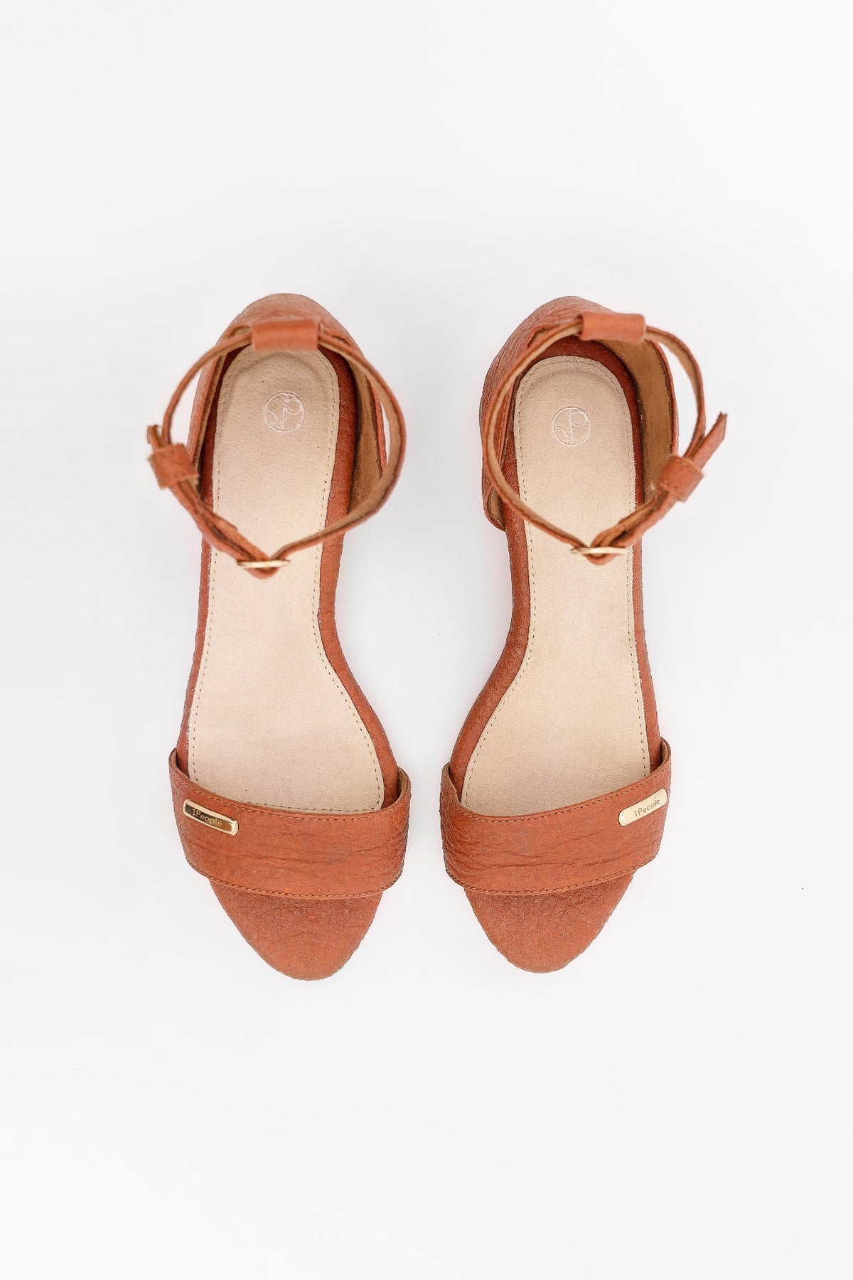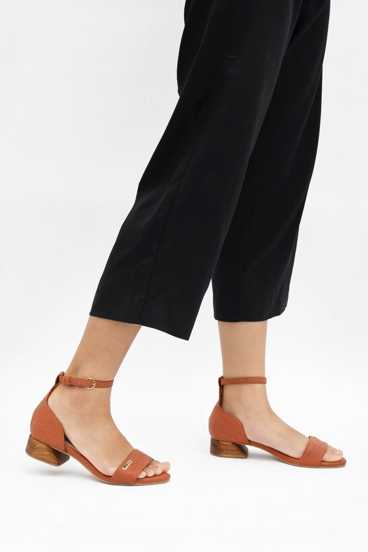 Details - 3 cm block heels made from ethically harvested teak wood & treated with Tung Oil- Signature 1 People recycled brass logo- Open toe- Ankle straps, adjustable- Embroidered 1 People logo on the insole in matching colour - Eco-friendly insole materials- Crafted from innovative and sustainable textile - Piñatex®- Available in 2 colours - Charcoal and Canela- GOTS certified dyed Piñatex®- GRS certified Eco Suede
