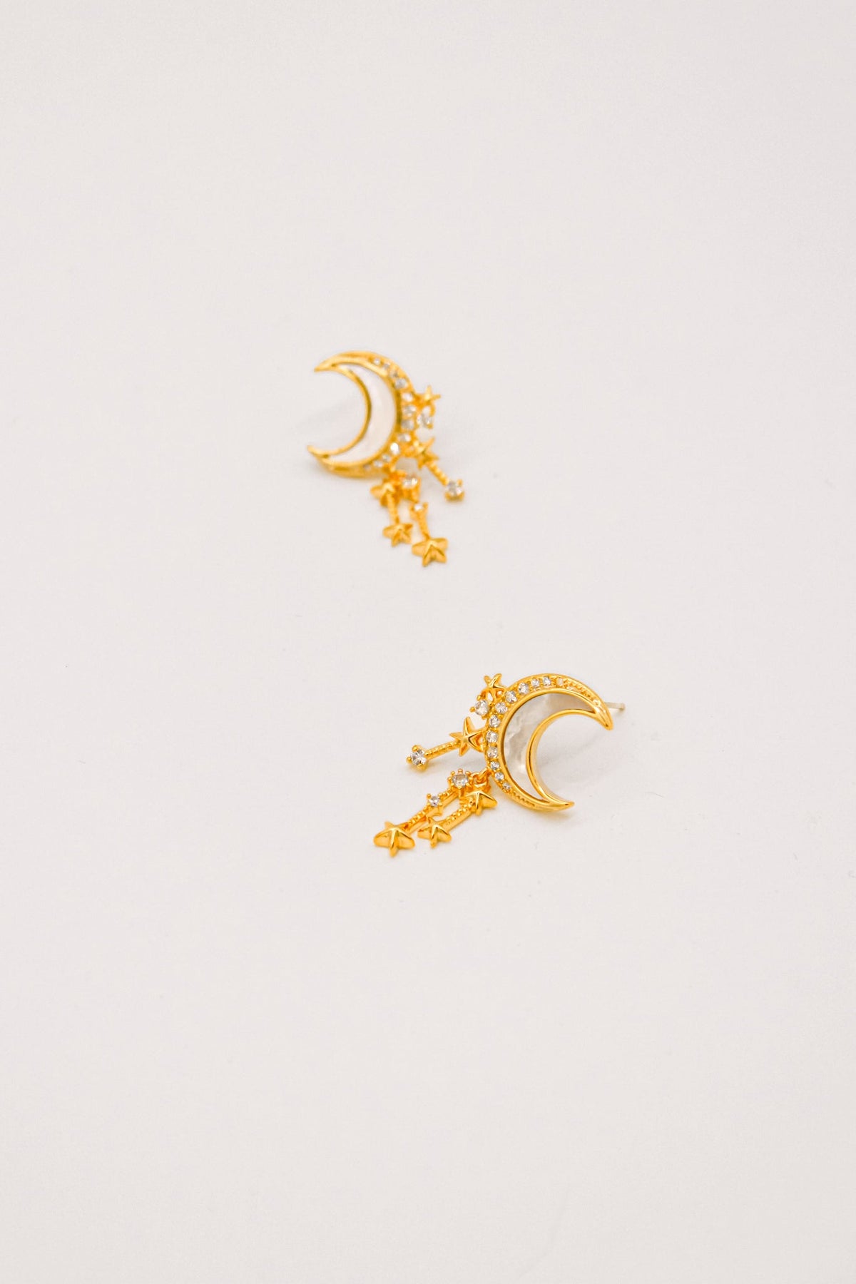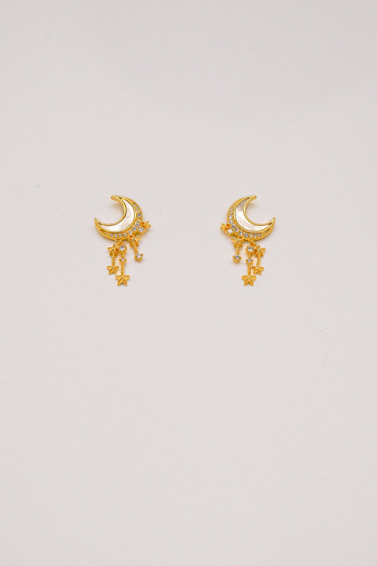 Handcrafted in Italy, these celestial-inspired earrings feature a crescent moon adorned with cubic zirconia, with a delicate cascade of stars adding a dreamy touch. The 18K gold-plated brass ensures durability while maintaining a lightweight and waterproof structure, perfect for both special occasions and everyday elegance.