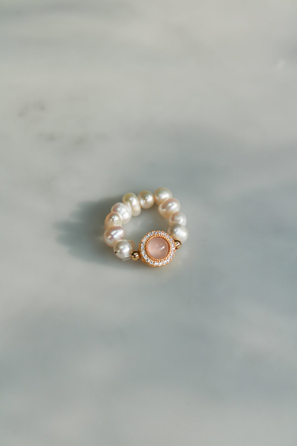 Handmade in the UK, this beautiful ring features genuine freshwater pearls strung together with an 18K gold-plated base. The centrepiece showcases a pink quartz gemstone surrounded by a halo of cubic zirconia for a touch of sparkle. This ring is perfect for adding elegance to any occasion, and its adjustable design ensures a comfortable fit. Waterproof and designed to last, this piece is a stunning addition to your jewellery collection.