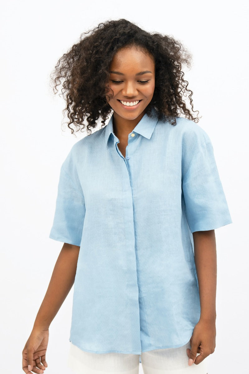 Details - Wide, square fit- Pointed stand collar- Hidden button-up front- Elbow-length kimono sleeves- The dye of Licorice & Sommerhus are GOTS certified- The buttons are Eco-rozo, recycled buttons made from tagua waste
