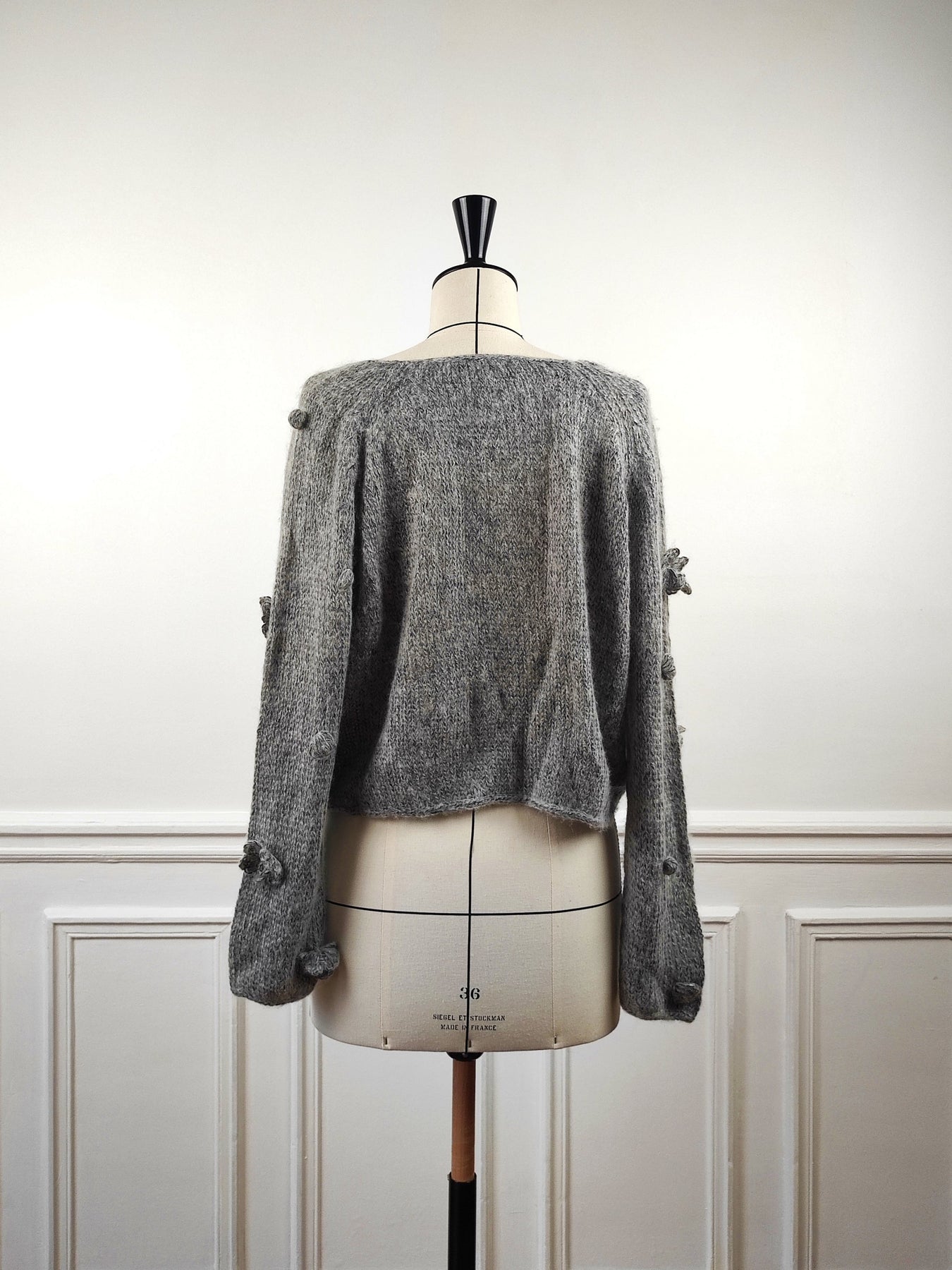 Cropped sweater wide V neck style. The ultimate in hand-knit refinement and embellishment. A timeless piece for winter and mid-seasons.