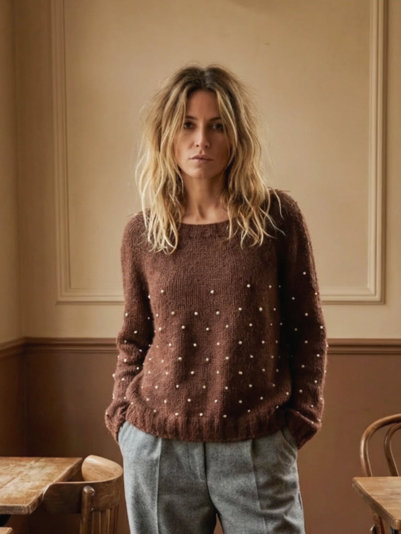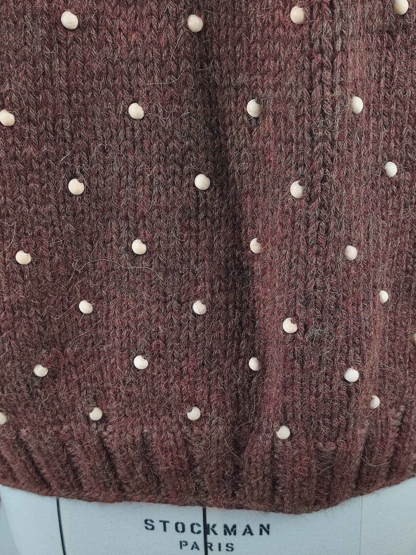 Hand-knitted sweater with seamless construction. White wooden beads embellishment